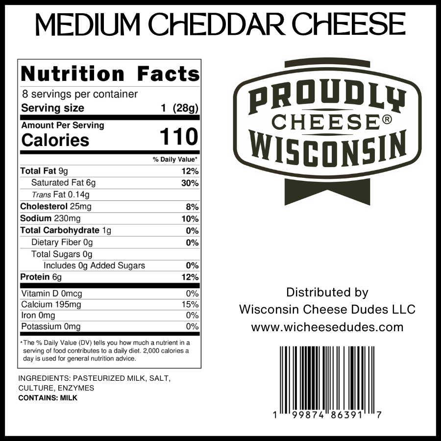 Enjoy the easy, crowd-pleasing flavor of our 8oz Medium Cheddar Cheese. This Wisconsin cheddar has a smooth texture and balanced bite that makes it perfect for sandwiches, burgers, cheese trays, and everyday snacking. It is a versatile cheddar that delivers just the right amount of flavor without being too mild or too sharp.